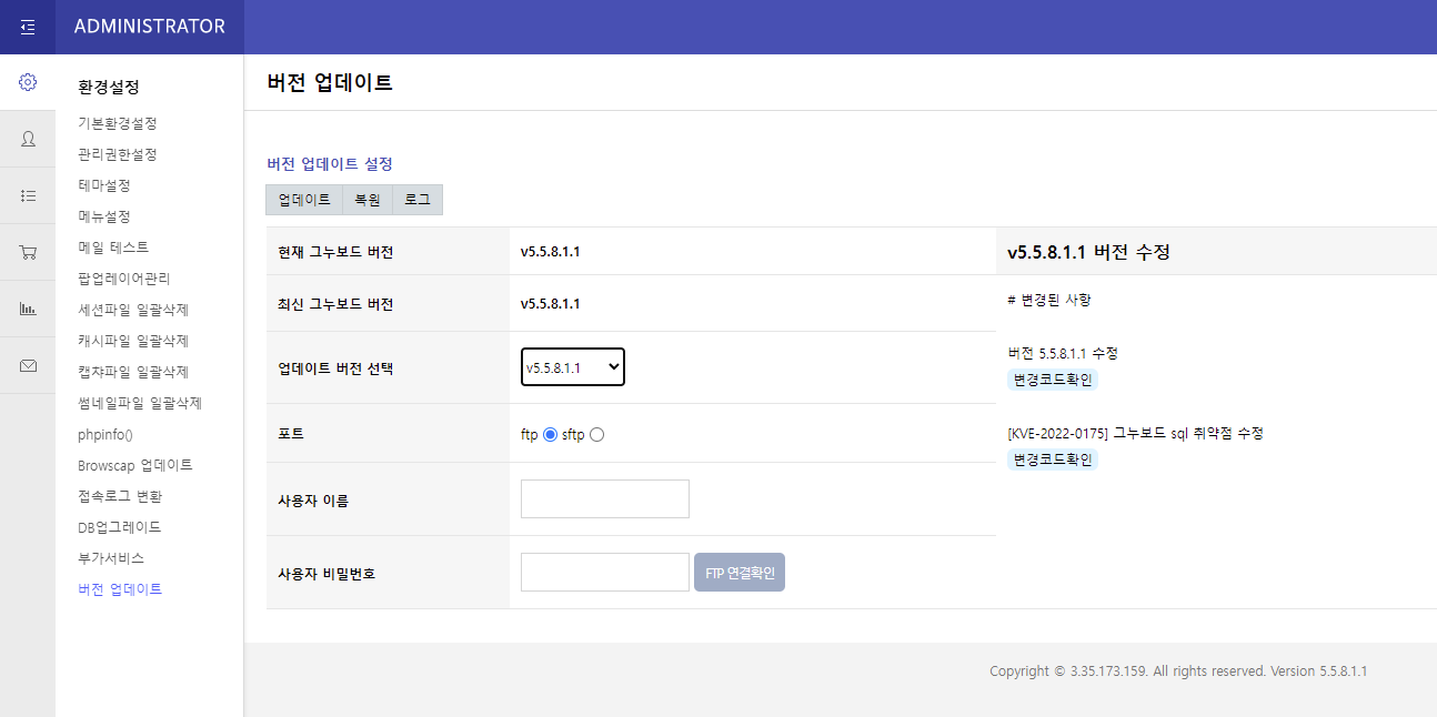 • 그누보드 업데이트 지원 버전은 최신 30개의 버전이 지원됩니다. (https://github.com/gnuboard/gnuboard5/releases 기준)