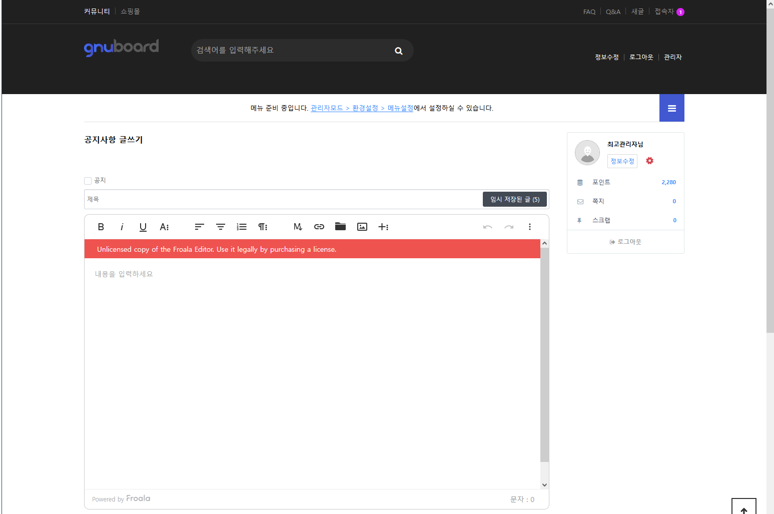unlicensed copy of the Froala Editor Use it legally by purchasing a license. 문구가나오고 있습니다.
