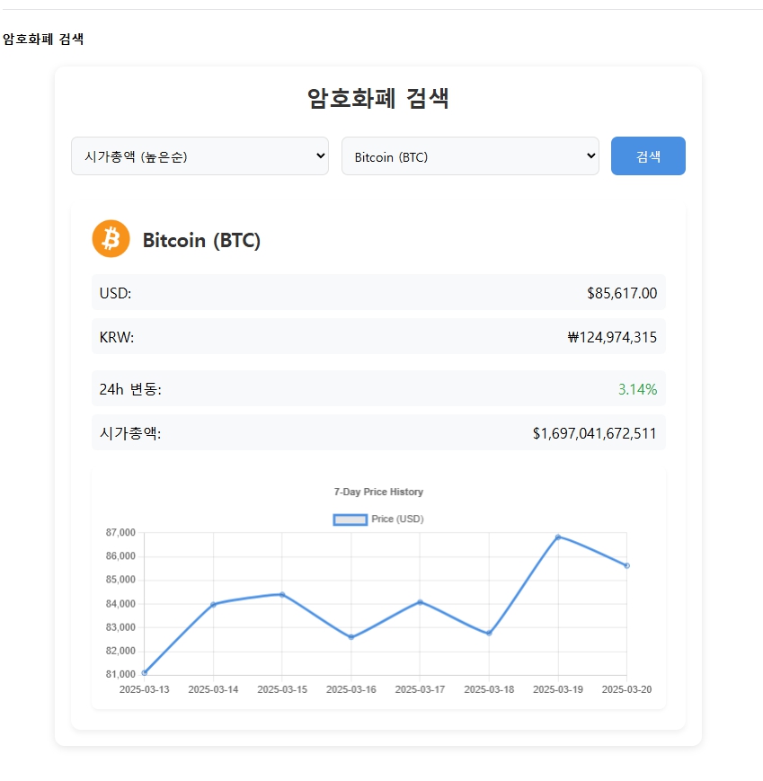 무료인 CoinGecko API를 이용해서 coin 가격을 실시간 검색하게 구현하였습니다.