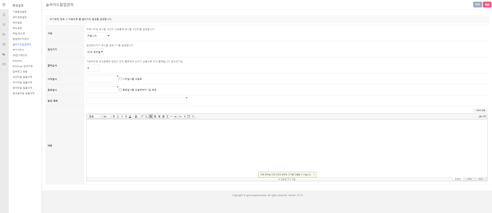 - 관리자접속 시 슬라이드팝업관리 메뉴가 생성됩니다.