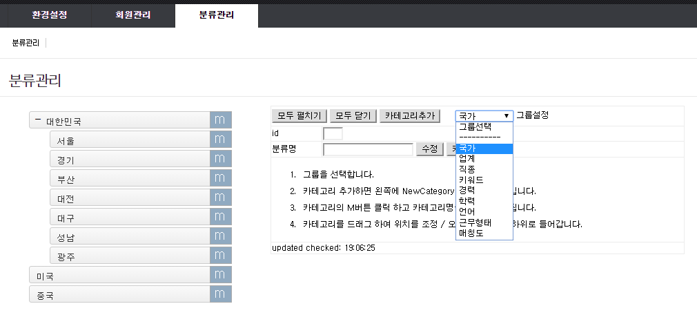 ex) 여분필드1 값 국가,업계,직종,키워드,경력,학력,언어,근무형태,매칭도