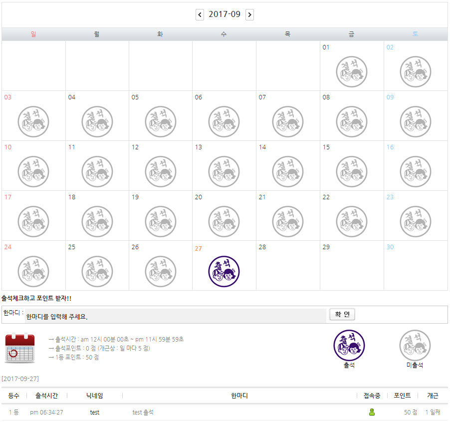 5. 홈페이지/그누보드5/plugin/attendance/attendance.php 접속