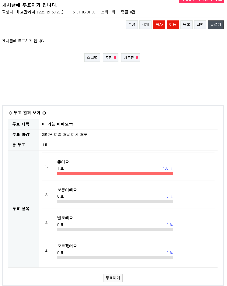 그누보드5의 투표가 아닌 게시글 작성자가 게시글 작성할때 투표도 함께 등록할수 있는 기능의 무료 프로그램입니다.