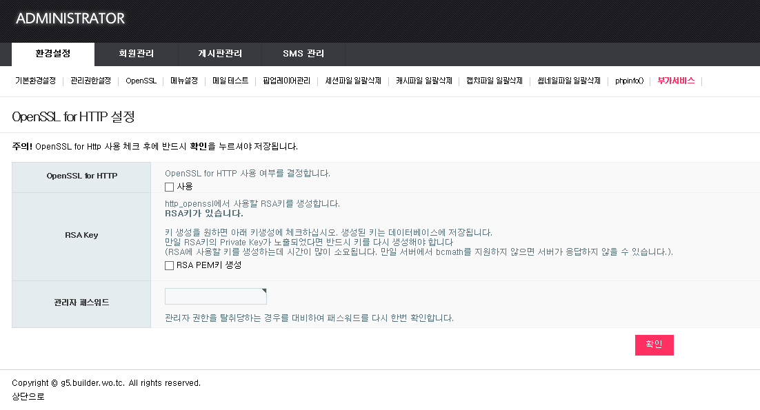 환경설정 > OpenSSL 에서 OpenSSL 사용과 RSA PEM키 생성 체크박스에 클릭하시고 확인 버튼을 누르시면 됩니다.
