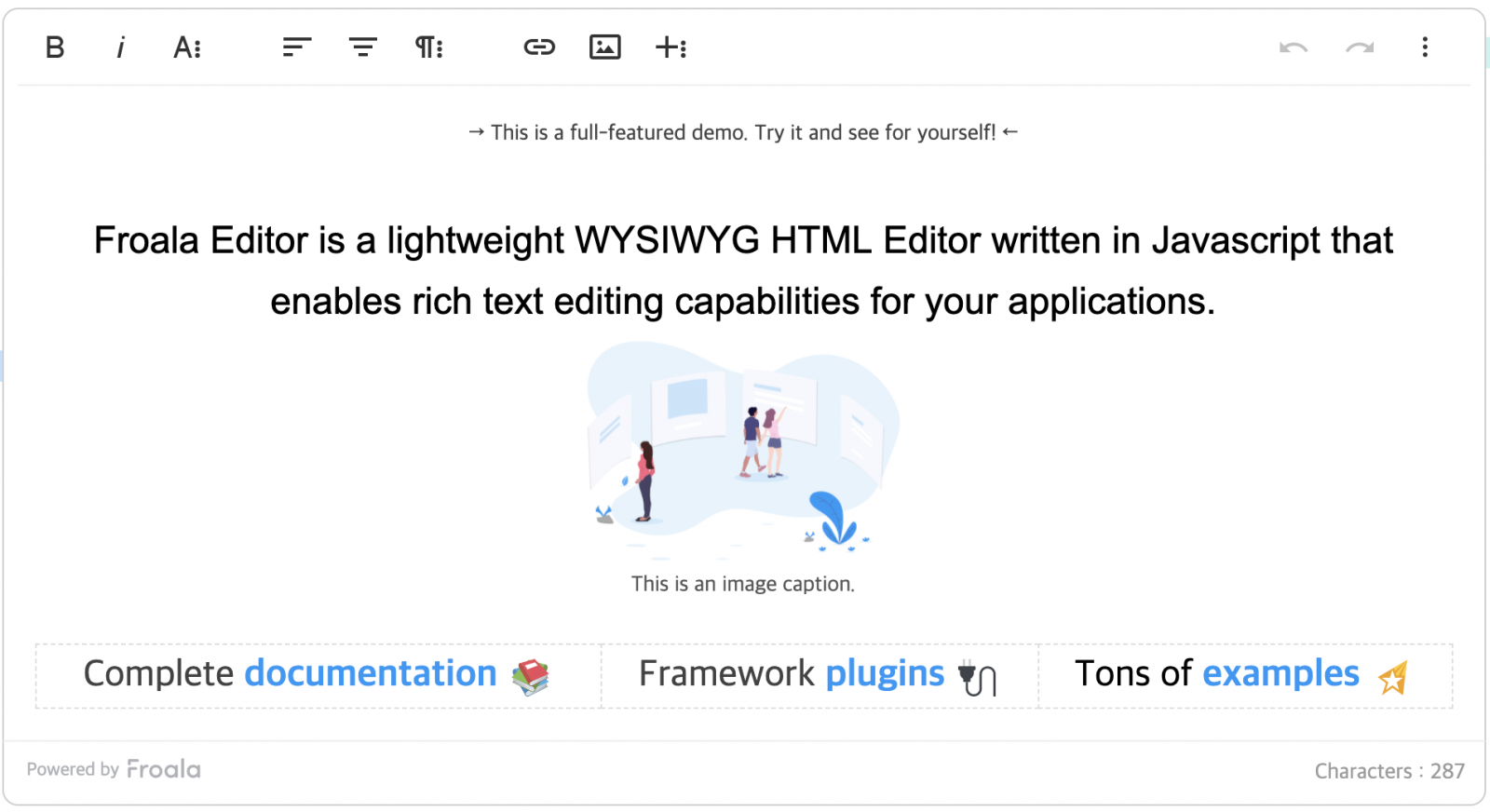 https://froala.com/wysiwyg-editor/examples/ - API Docs