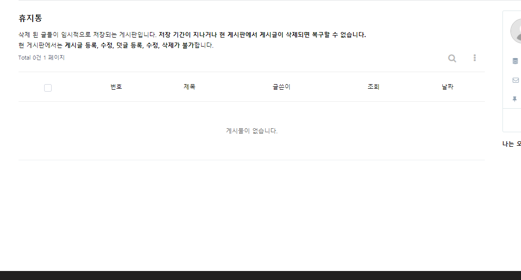 정상적으로 적용한 후에 휴지통 게시판을 접근하면 위 캡쳐 화면처럼 구성된 게시판이 보이게 됩니다.