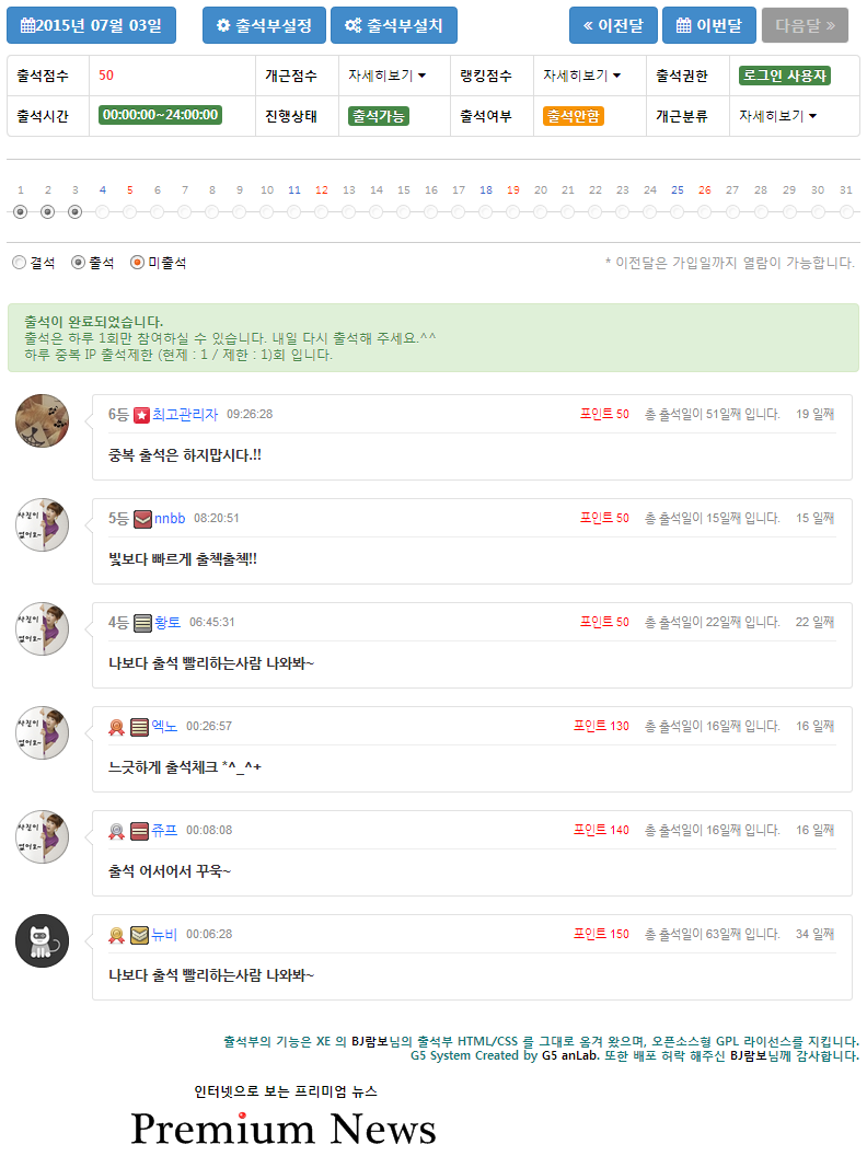 3. 개근 출석시 개근 출석 포인트 출력되게 수정되었습니다.