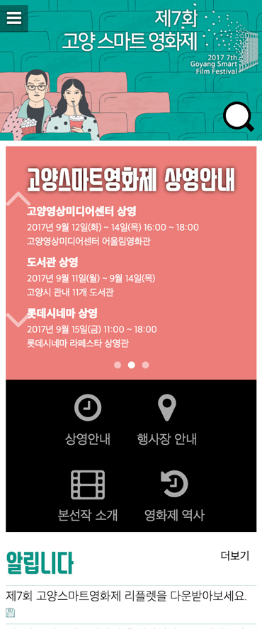 내용관리에 넣은 콘텐츠들에도 반응형 디자인을 적용해두었습니다. (상영안내 같은 콘텐츠)