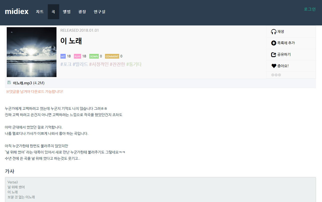스스로 곡을 올려서 스트리밍 서비스를 할 수 있고 앨범 구성이 가능한 커뮤니티 사이트입니다.