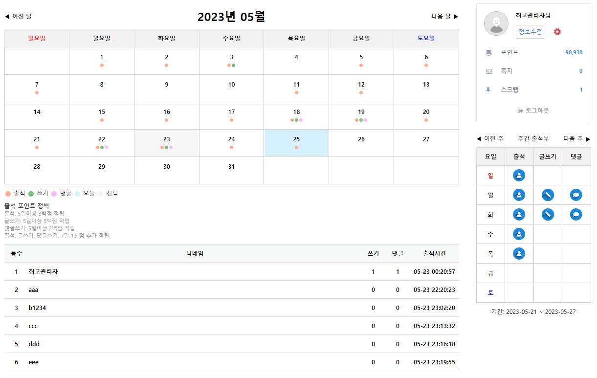 7일 출석, 글쓰기, 댓글쓰기 포인트지급