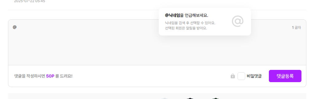 게시물 등록 또는 댓글 등록시 @를 입력하면 회원을 검색할 수 있고,