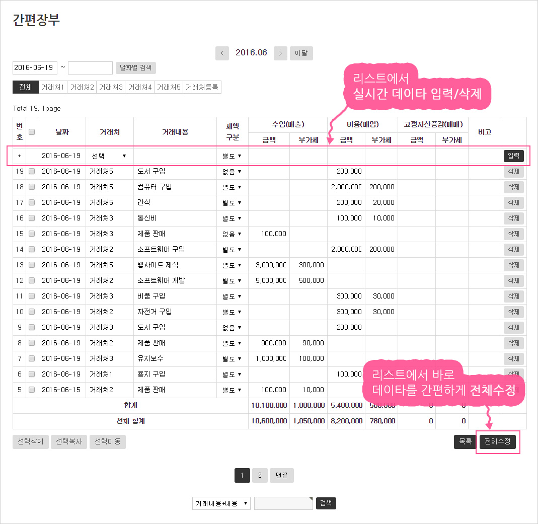 - 거래내역을 월별, 기간별, 거래처별로 볼 수 있습니다.