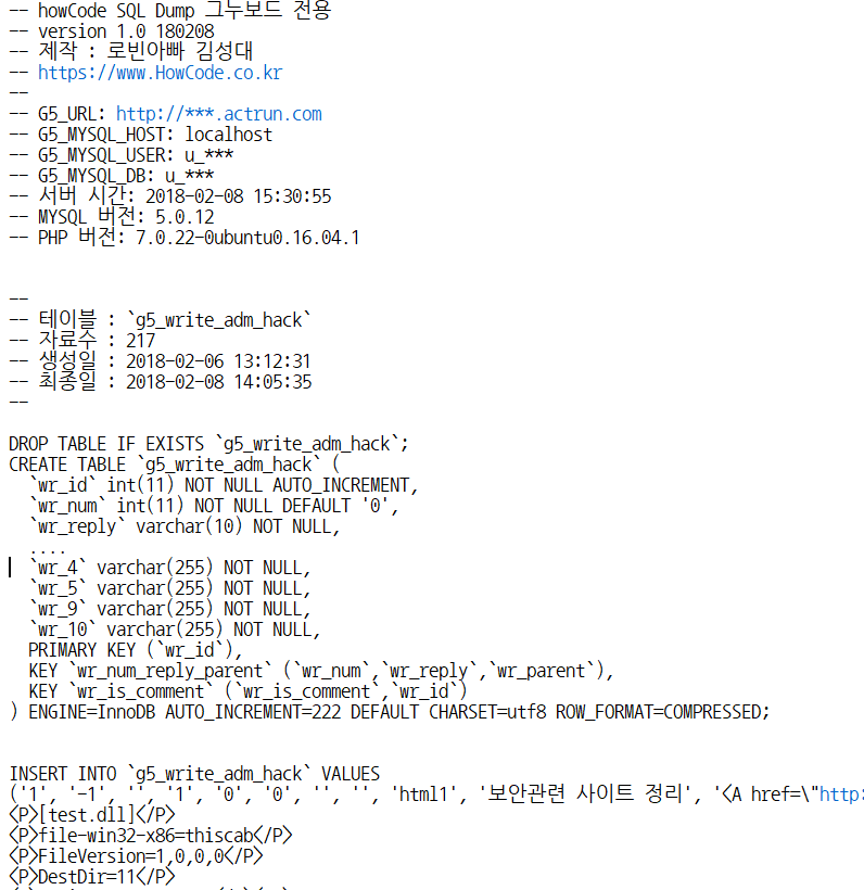 사용방법 : 관리자메뉴에 생성된 "HowCode SQL 덤프" 클릭