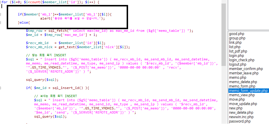 같은 동성끼리는 쪽지를 보낼 수 없게 하고 싶읍니다.