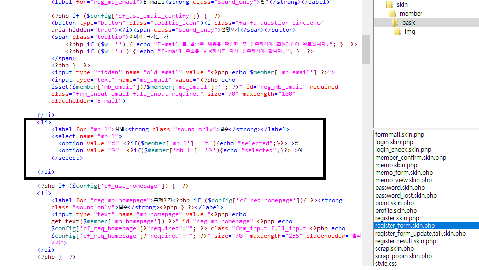 1번째 이미지 소스는 회원가입 을 할때에 성별을 회원 여분 필드인 mb_1 넣는 스킨 소스를 수정 한것
