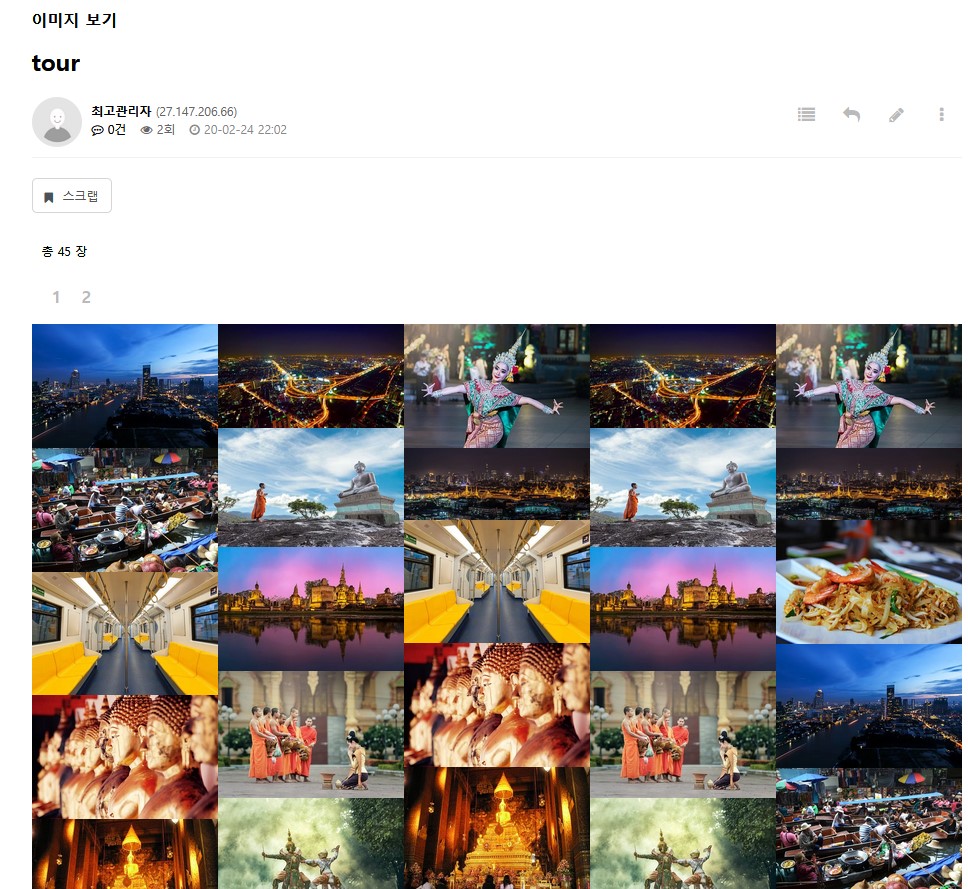 해당 목록글을 누르시면 됩니다. 그럼 tour 이라는 테이블을 가진 게시판의 사진을 한꺼번에 불러 옵니다.