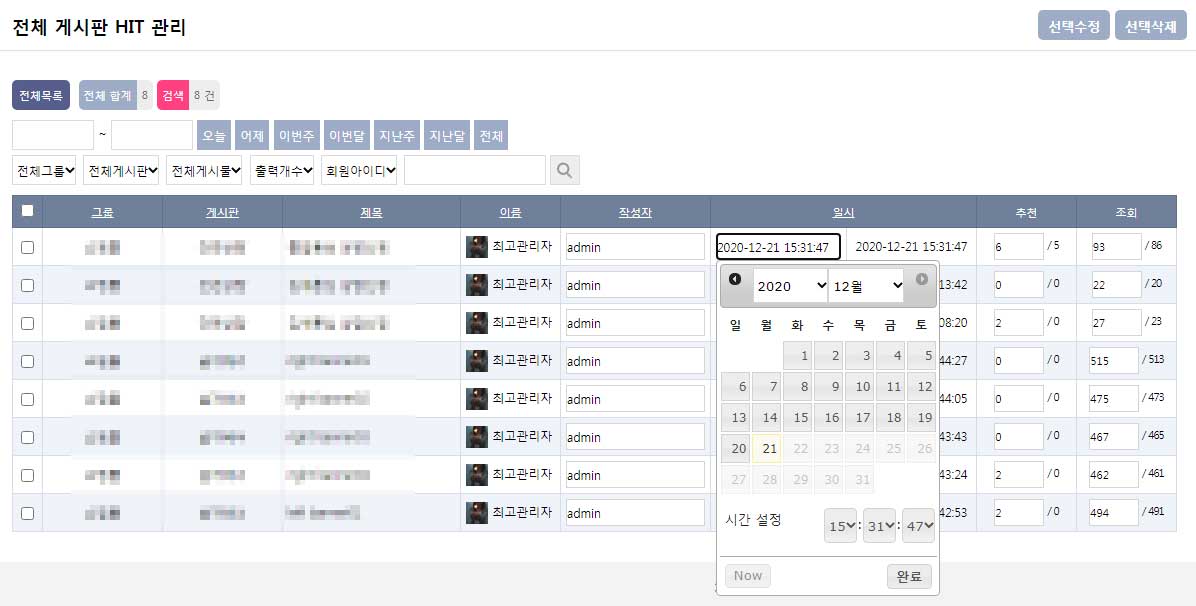 관리자에서 등록일, 조회수, 추천수를 관리 할 수 있는 파일입니다.