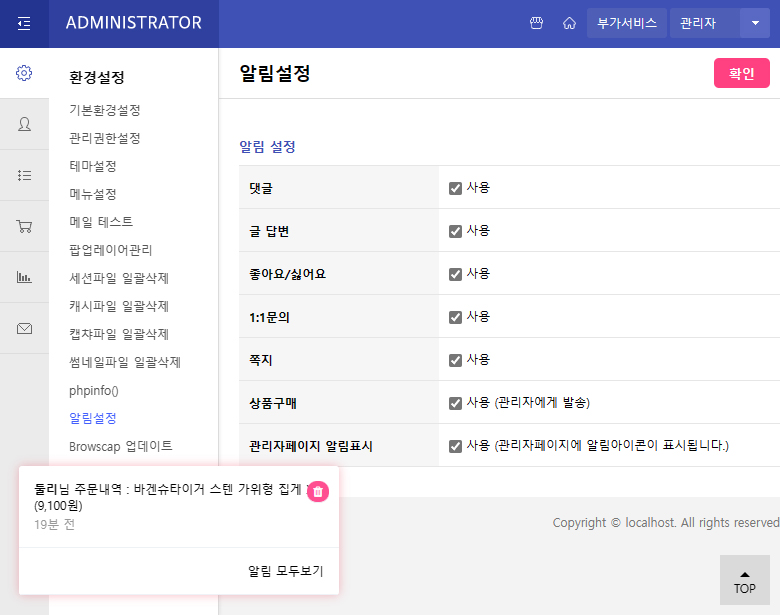 2. 쇼핑몰 사용시 관리자에게 알림 발송 설정 가능