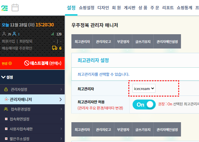 적용한 사이트 미리보기에서는 제공하는 최고관리자로 로그인하면, 대표관리자보안이 적용되어 로그인한 최고관리자로는 변경이 않되는 것을 확인할 수 있습니다.