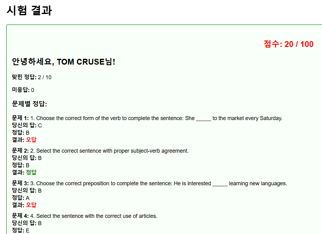 정답을 제출하면 process.php에서 정답을 비교해서 채점한후에 결과를 서버에 있는 results.csv에 저장하고, 응시자의 점수와 오답여부를 알려줍니다.