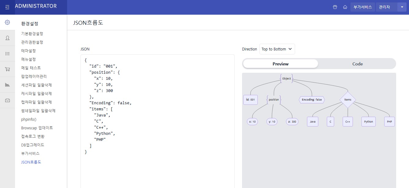 $menu['menu100'][] = array('100600', 'JSON흐름도', G5_ADMIN_URL . '/json_flowchart.php', 'cf_json_flowchart');