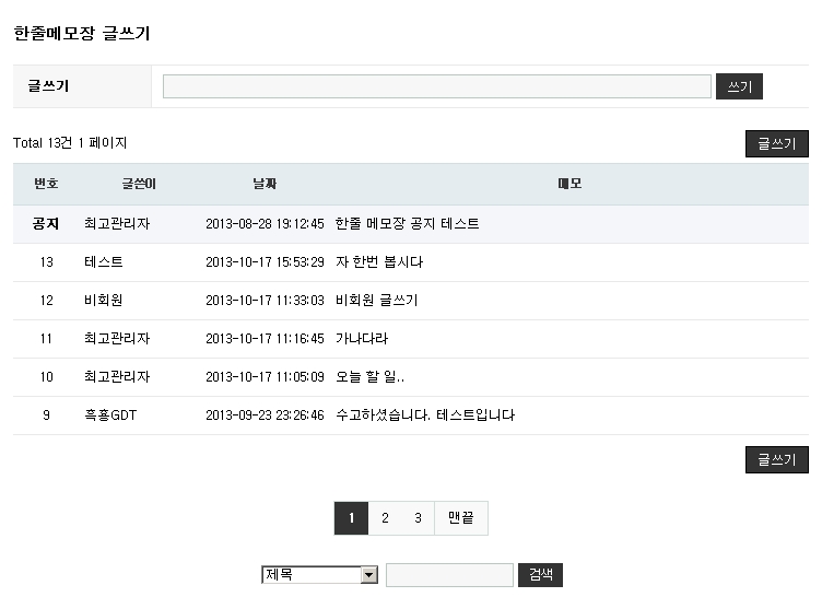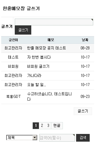 리스트 화면 상단에 글쓰기 폼이 붙어 있는 형태입니다.