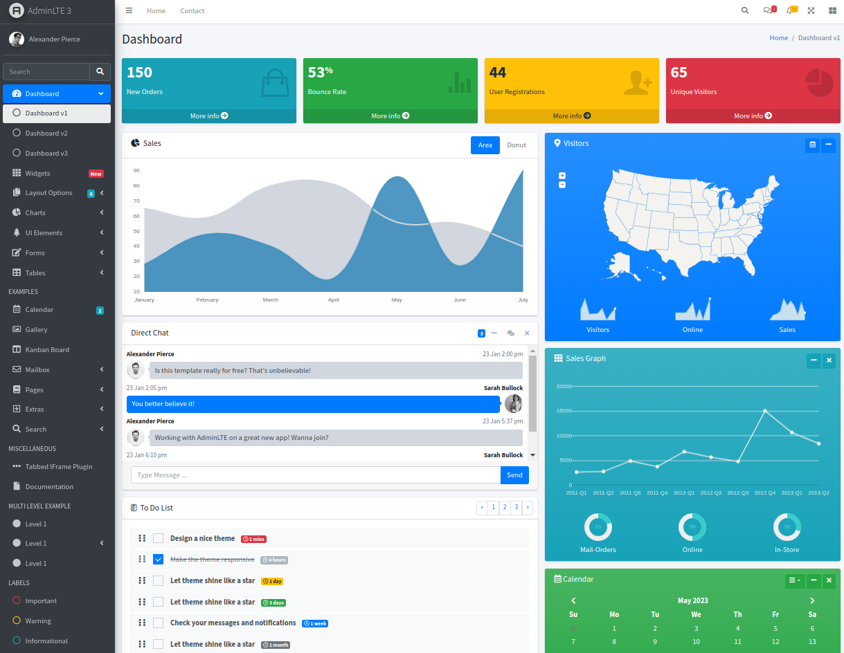 2) 테마의 샘플사이트를 보면, 대시보드에 다양한 그래프와 위젯들이