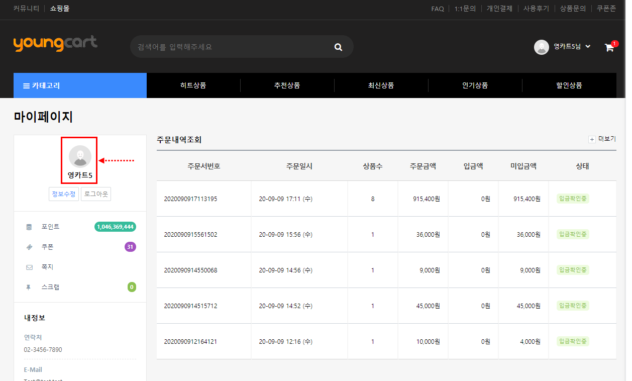 쇼핑몰마이페이지에서 회원정보이미지 확인하기 (위의 체험아이디로 로그인해야 보임)