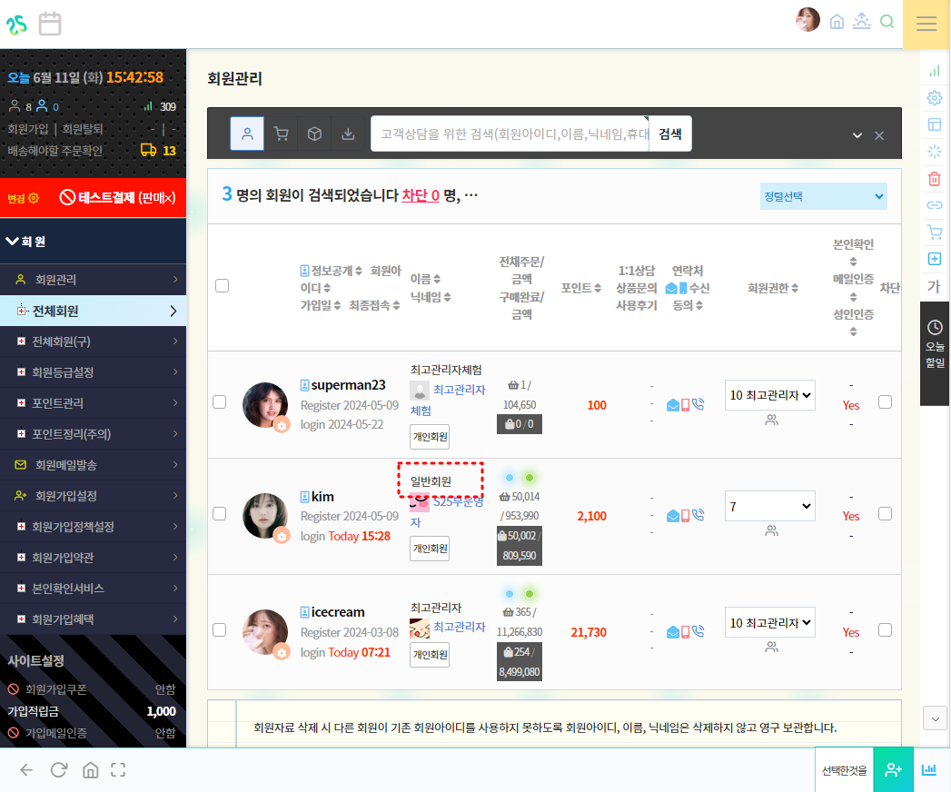 3레벨일경우 "일반회원" 으로 설정했다면 회원목록에도 "일반회원" 으로 변환되서 표시됩니다