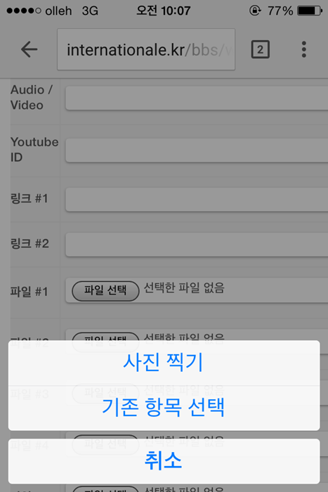 [code]<input type="file" accept="image/*" capture="camera" name="bf_file[]" title="파일첨부 <?php echo $i+1 ?> : 용량 <?php echo $upload_max_filesize ?> 이하만 업로드 가능" class="frm_file frm_input">[/code]
