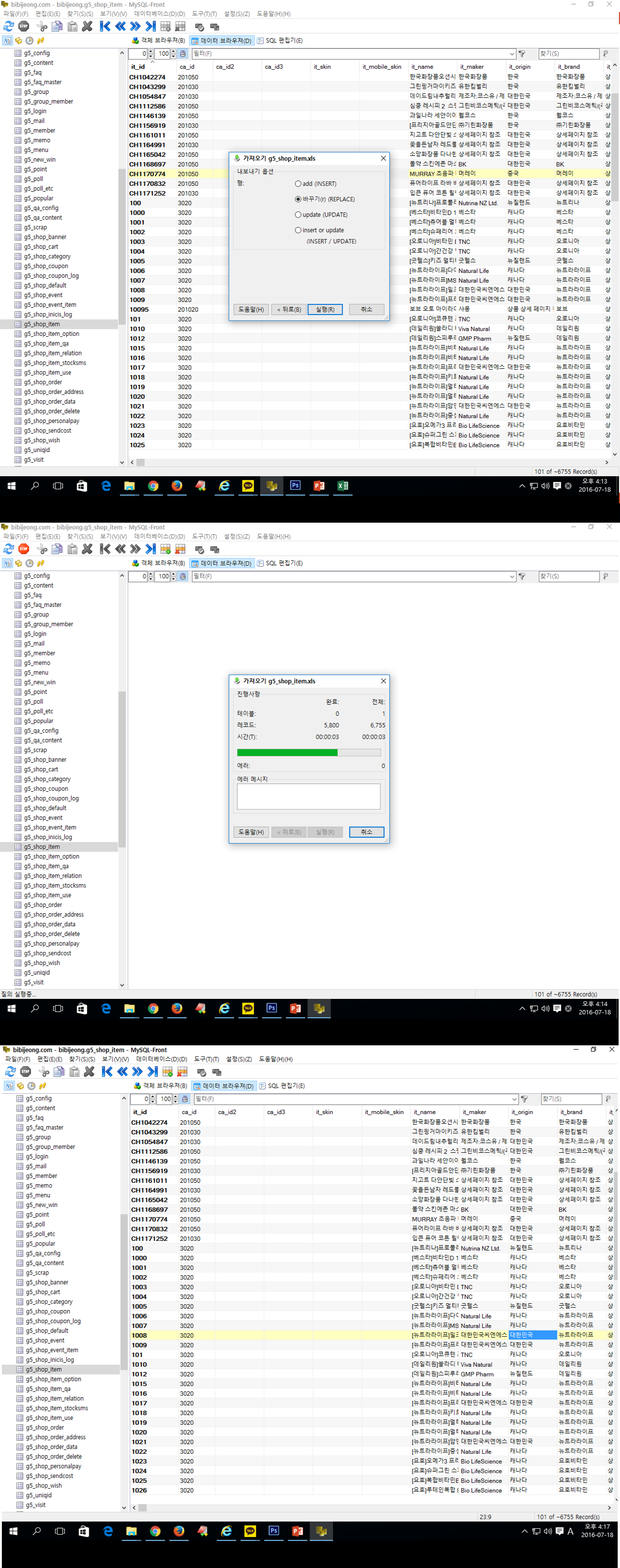 참고로 디비 일괄 변경시 디비 내보내고 가져오기 할 때 인코딩은 utf-8로 하시고, 액셀 확장자는 csv 보다는, 액셀 97-2003worksheet로 하는게 오류나 한글깨짐현상이 없습니다.