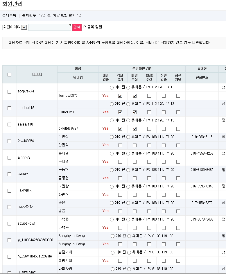 회원아이디 검색버튼 옆 "IP 중목 정렬" 링크를 클릭하면 됩니다.