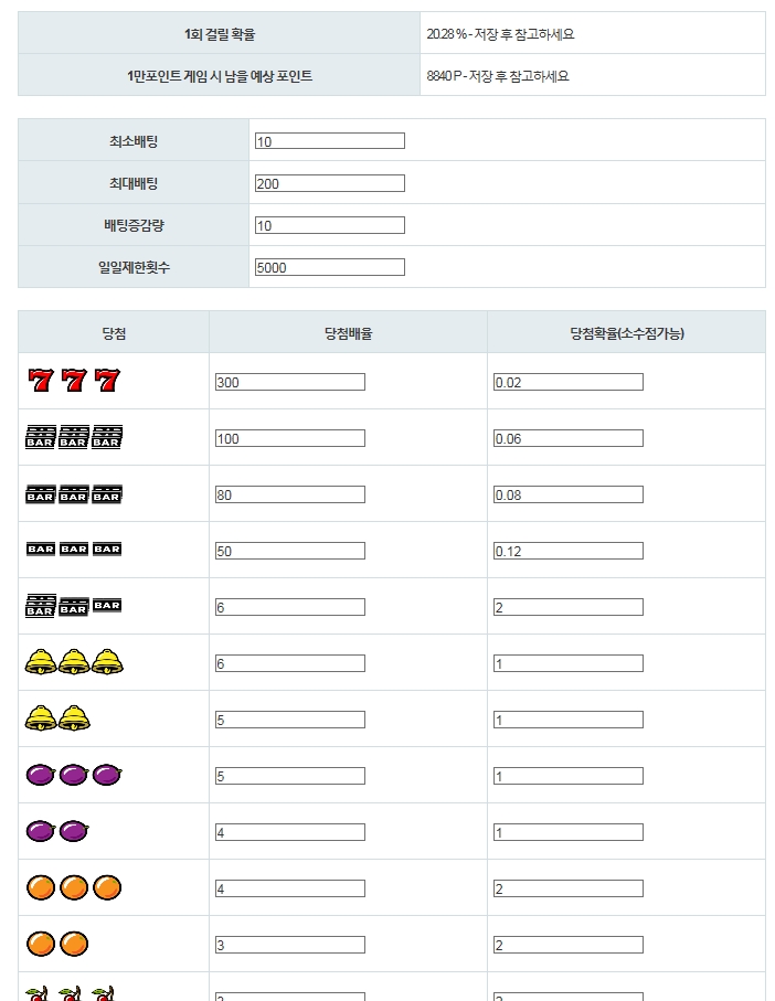 설정으로 잭팟 확율 및 금액, 최소 최대 배팅 값 일일 허용 치 등이 조정이 가능합니다.