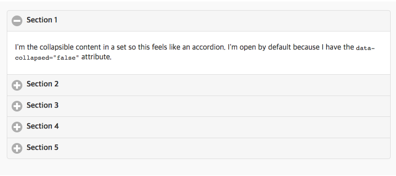 기본적으로 모든 접을 수있는 섹션이 축소됩니다. 페이지가로드 될 때 열려있는 섹션을 설정하려면 data-collapsed="false"펼치려는 섹션의 제목에 속성을 추가하십시오 .