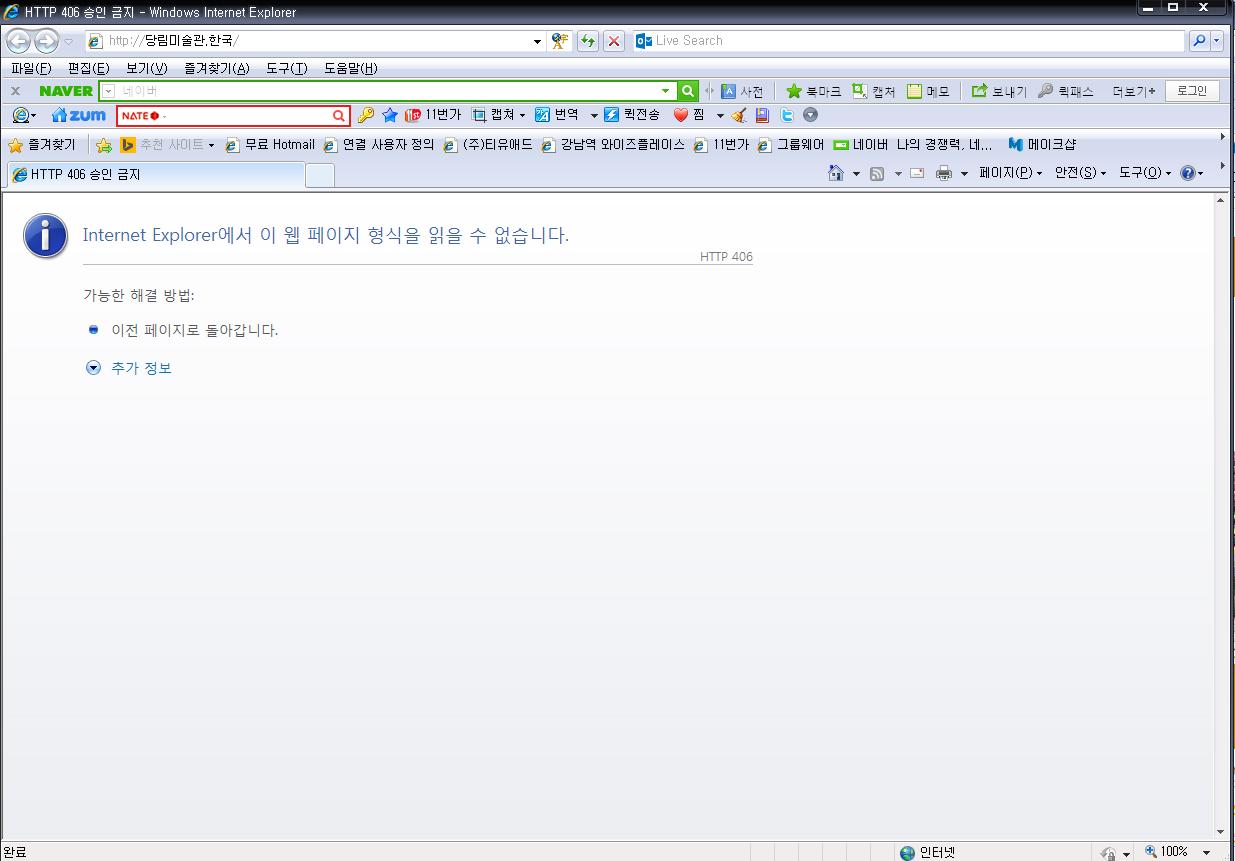 첨부한 그림과 같이 http 406 이나오면서 홈페이지가 안열리네요. f5를 한번더 클릭하면 나와요.