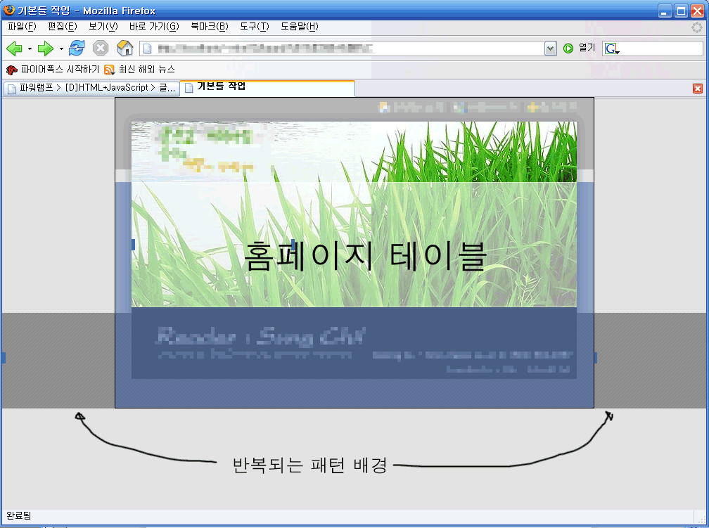 하단 사선 패턴배경을 그냥 테이블 백그라운드로 넣으면 오른쪽은 상관 없지만, 브라우져 크기에 따라 왼쪽 경계선 부근이 어긋나게 됩니다.
