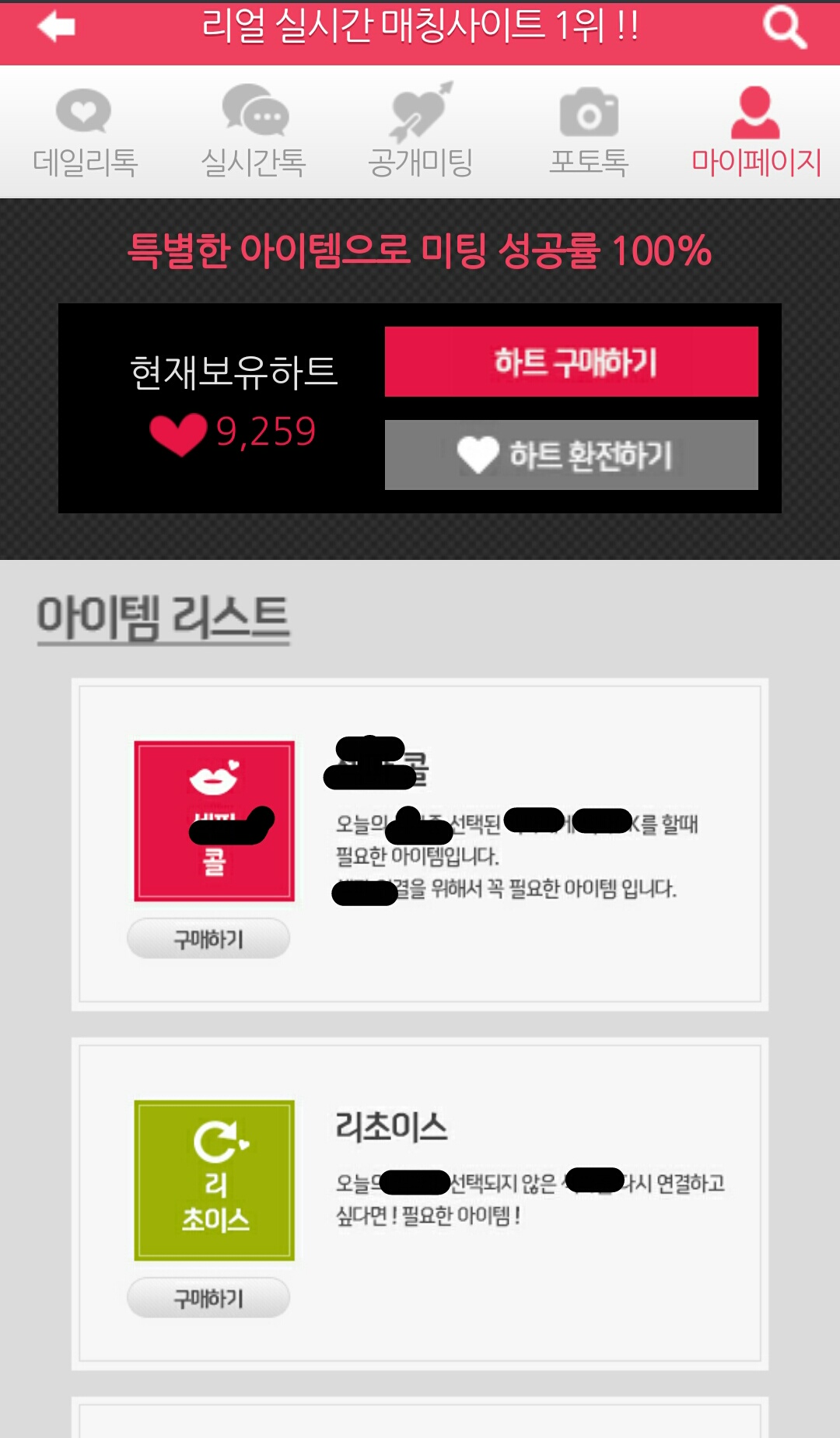 선택이 가능함, 맘에드는 회원 프로필을보고 미팅요청을 보내려면 아이템필요, 여성회원이 미팅