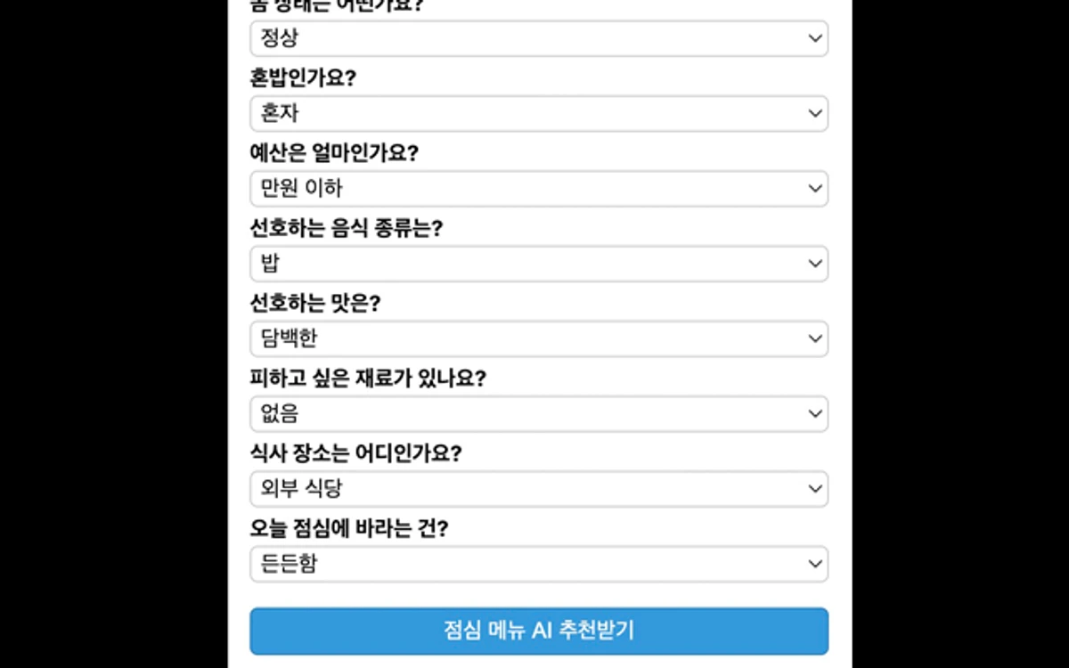 간단한 질문 10개에 답하면, 당신에게 맞춤형 점심 메뉴를 제안해드립니다.