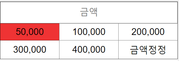 이렇게 표를 작성하고 금액을 선택 했을 시에 버튼의 색상이 바뀌면서 변경색상이 유지되게 코드를 짜야하는데 제가 검색을 잘 못하는건지 ㅠㅠ 찾기가 어려워서 이렇게 질문을 남깁니다! 고수님들 알려주세요!