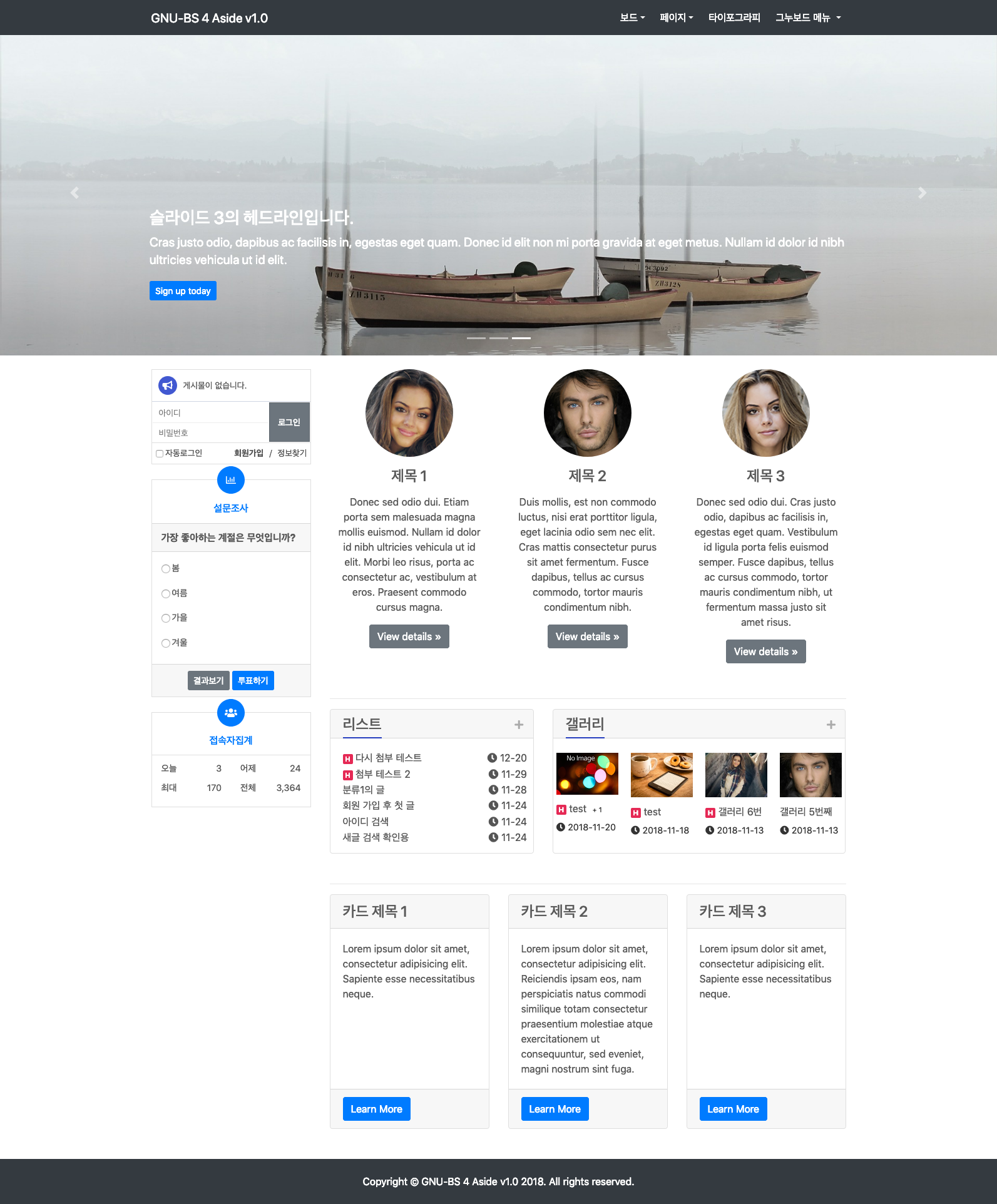 그누보드 5.3과 부트스트랩 4를 결합하여 제작한 그누 반응형 테마이며, 사이드 메뉴가 있는 버전입니다.