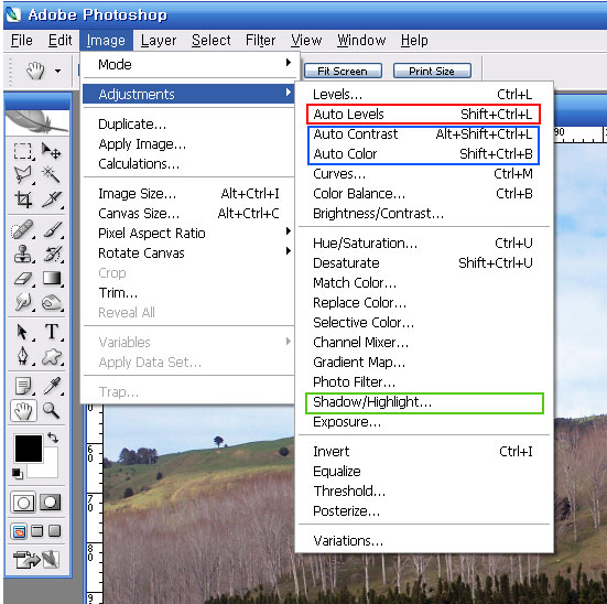 3번째 초록색라인의 메뉴를 사용하여 간단한 설정으로 어두운 부분과 밝은 부분의 차이를 줄일 수 있습니다. 포샵을 사용하기전 디지털 카메라 사용시 설정목표물이 그늘에 있을경우 일명 반셧트시 어두운 부분에 포커스를 먼져 맞추고 사물을 찍으면 명도대비를 줄일 수도 있습니다.<div class='small'>[이 게시물은 관리자님에 의해 2011-10-31 16:52:33 Photoshop에서 이동 됨]</div>