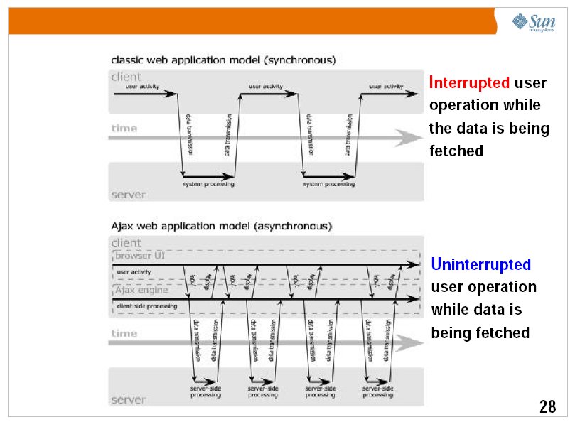 이 슬라이드(그림)는 또한 예전의 경우와(왼쪽) ajax의 경우를 보여주고 있습니다.