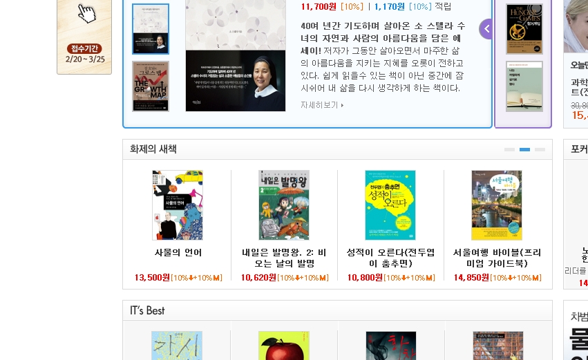 교보문고(http://www.kyobobook.co.kr)에 보면 중간 부분 화제의 새책 이라는 코너가 있습니다.