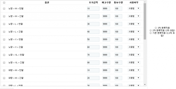 - 특정 상품에 지정된 기본, 2차, 3차 분류에 같은 옵션을 적용할 목적