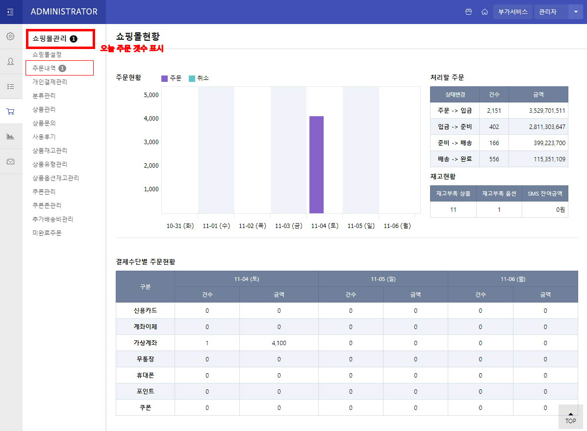 오늘 회원 가입수와 주문내역 수가 표시됩니다.