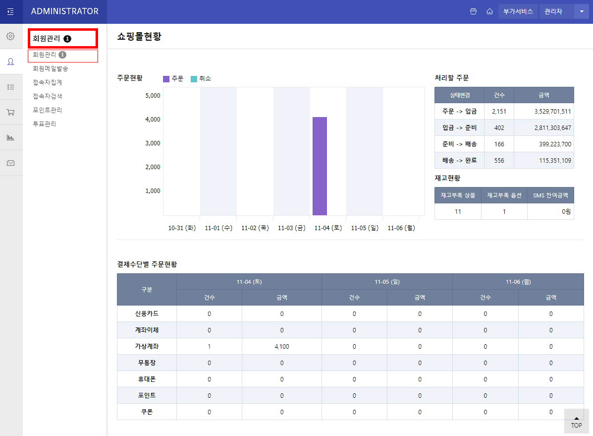 관리자모드에 들어가면, 오늘 들어온 주문과 오늘 가입한 회원이 있는 경우 좌측메뉴바에 건수가 표시되므로 바로 한눈에 오늘 발생한 일을 확인이 가능합니다.