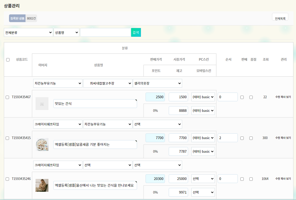 3) 최고관리자에 로그인 후 관리자메뉴중 상단의 " 상 품 " 을 클릭하시면 상품관리페이지가 뜹니다.
