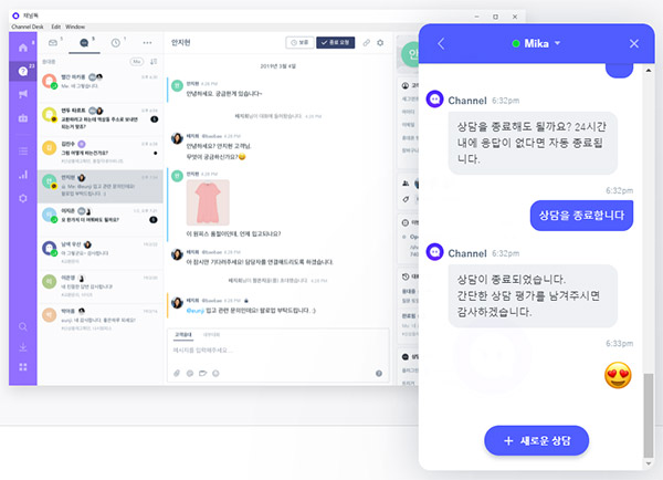 서비스업체는 채널톡 https://channel.io/ko 이며 방문자수 100명 미만은 무료사용이 가능합니다.