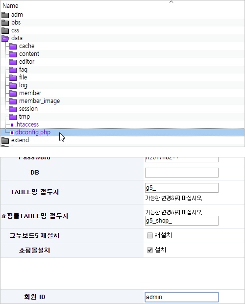 3. 'data/dbconfig.php' 파일을 삭제합니다.(data 폴더는 이미 만들어져 있으므로 새로 만들지는 않습니다)