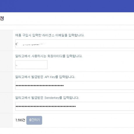 라이센스 등록 이메일과 알리고 회원 아이디, API Key, Sender Key를 입력한다.